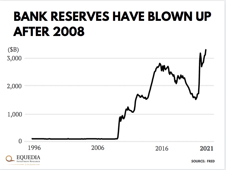 Take a look at how bank reserves blew up after the Fed printed trillions of dollars after 2008 and the beginning of Covid: