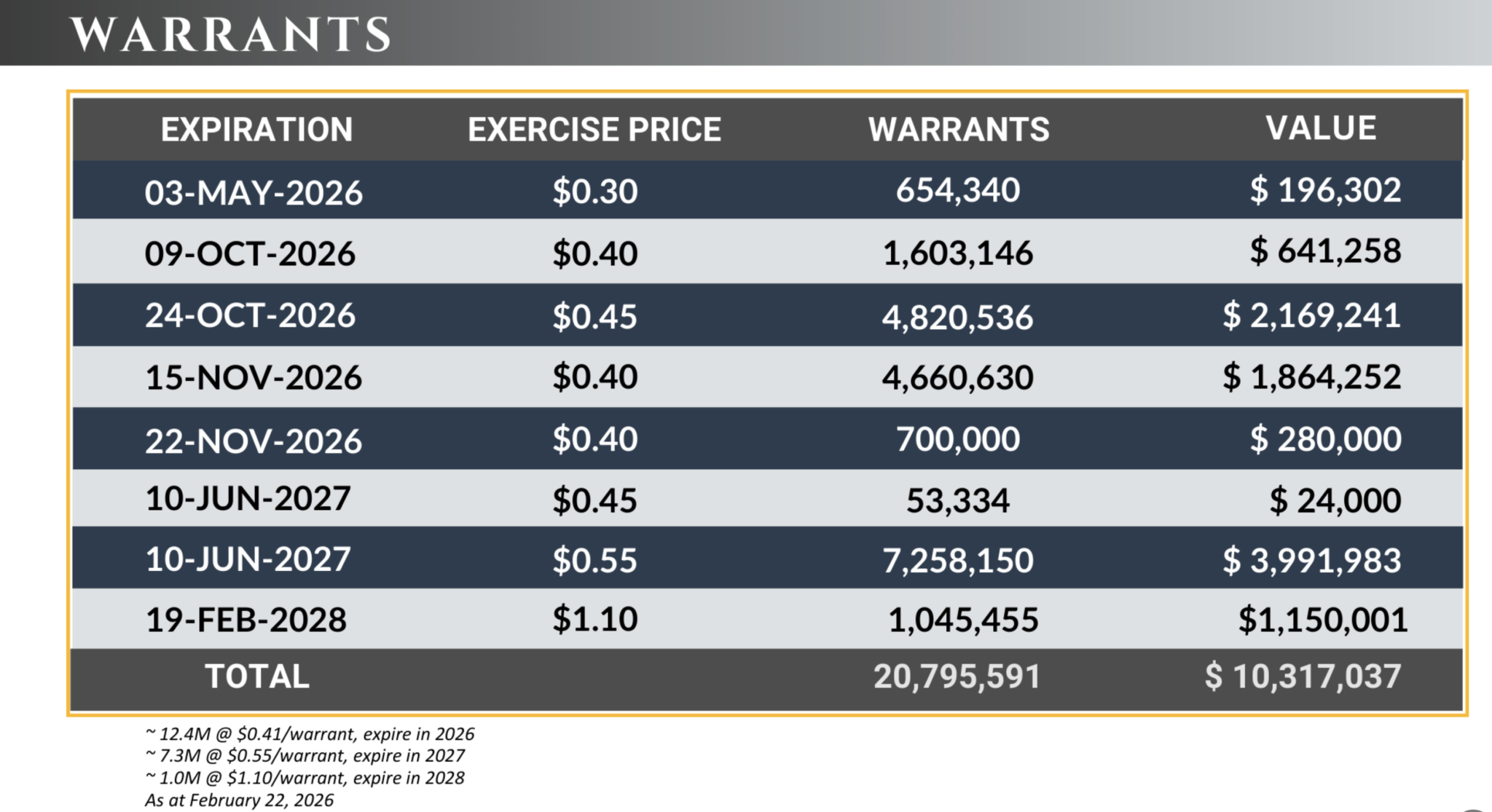 Lastly, WPG has a maiden resource targeted for the back half of 2026, plus 10,000+ metres of pending assays from the spring program, plus the metallurgical work continuing to de-risk the project. If the company delivers on what management has been telegraphing, “two at two” (2 million ounces at 2 g/t), the share price re-rating can happen while warrants are getting exercised. That’s a healthy distribution where WPG’s treasury fills, float expands, and the story keeps moving forward.
